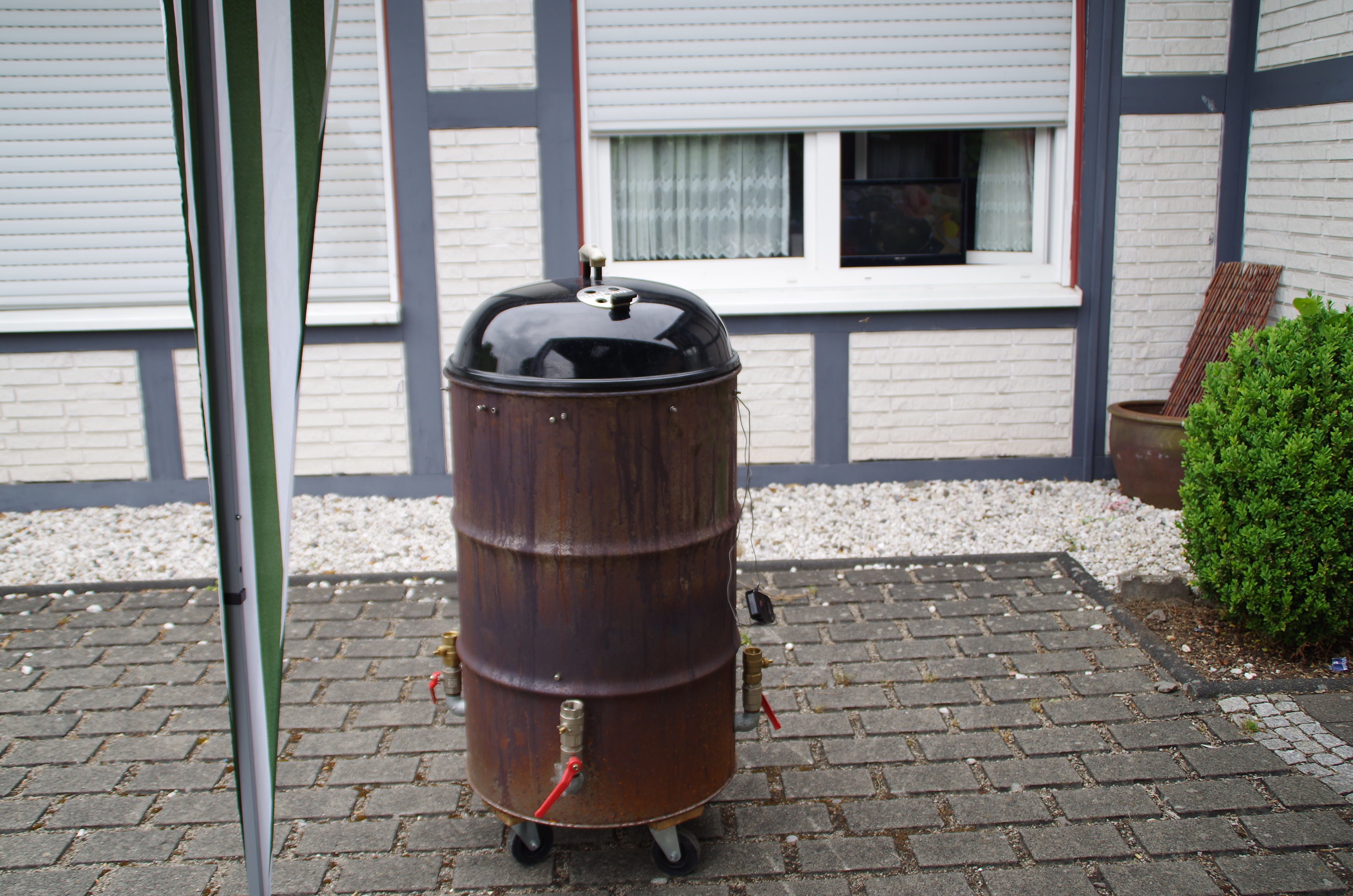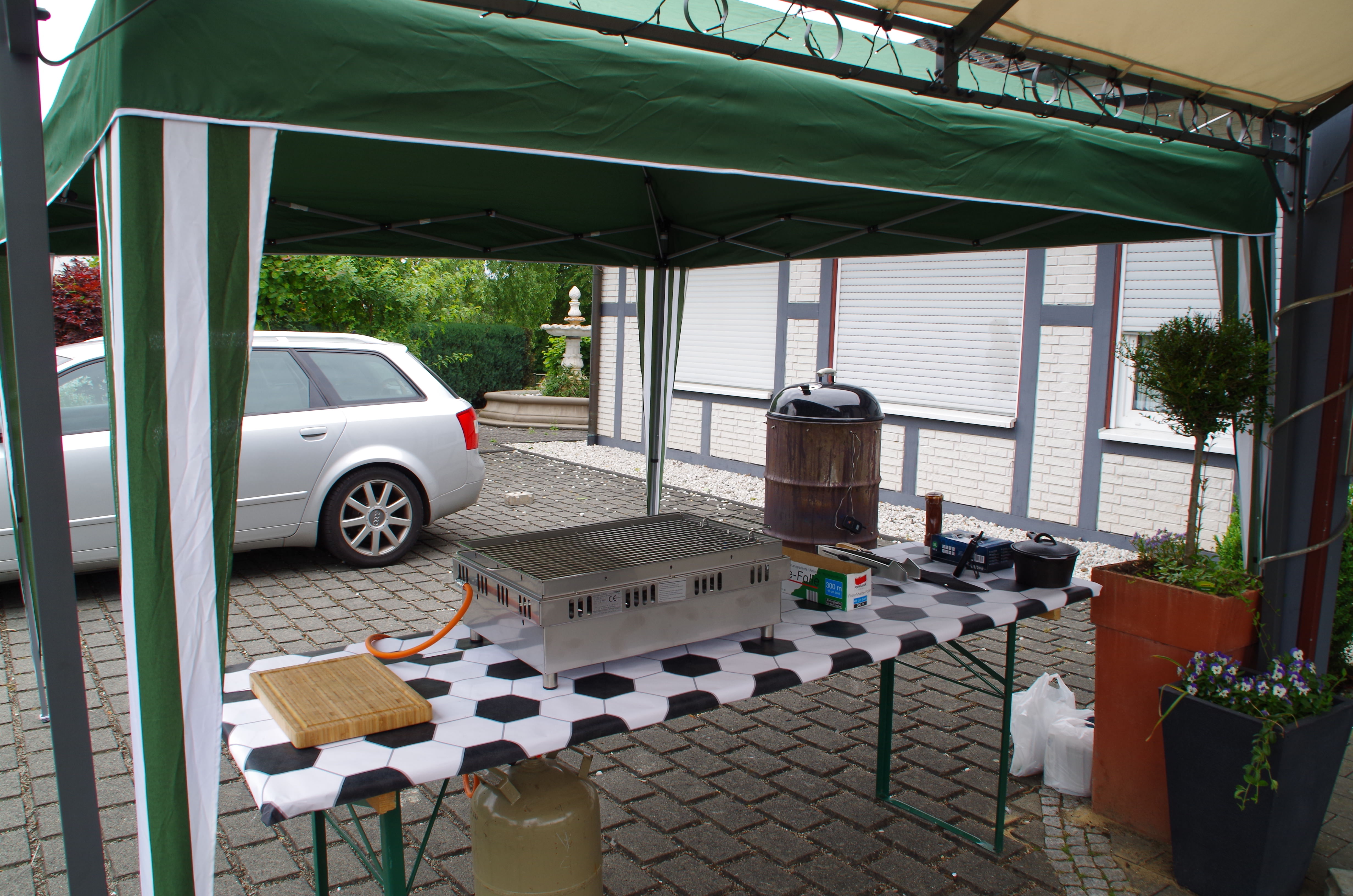 Das wird spannend. Nicht nur vom fußballerischen her sondern auch für uns ob denn überhaupt Leute kommen. 12 Karten sind im vorverkauf weg gegangen, ob das wohl reicht ?? 22 Facebook anmeldungen , ob das dann die Leute sind die auch die Karten gekauft haben ?? Naja , los gehts. Einen Tag vorher 3 Nacken gerubt, einen kleineren mit dem scharfen Rub und dann 2 größere mit dem dritten Versuch. Leider musste ich erst Arbeiten, so das es alles sehr kanpp wurde. Die Nacken sollten einfach als Nackenbraten aufgeschnitten werden. Meinen UDS habe ich aufgestellt und die Nacken um 15:00 Uhr aufgelegt, normal sollte es bis 17:00 Uhr möglich sein die Kertemperatur von 68 grad zu erreichen. Pavillion aufgebaut, Würstchengrill von Thyros aufgebaut und die Dinge erwarten die kommen.
