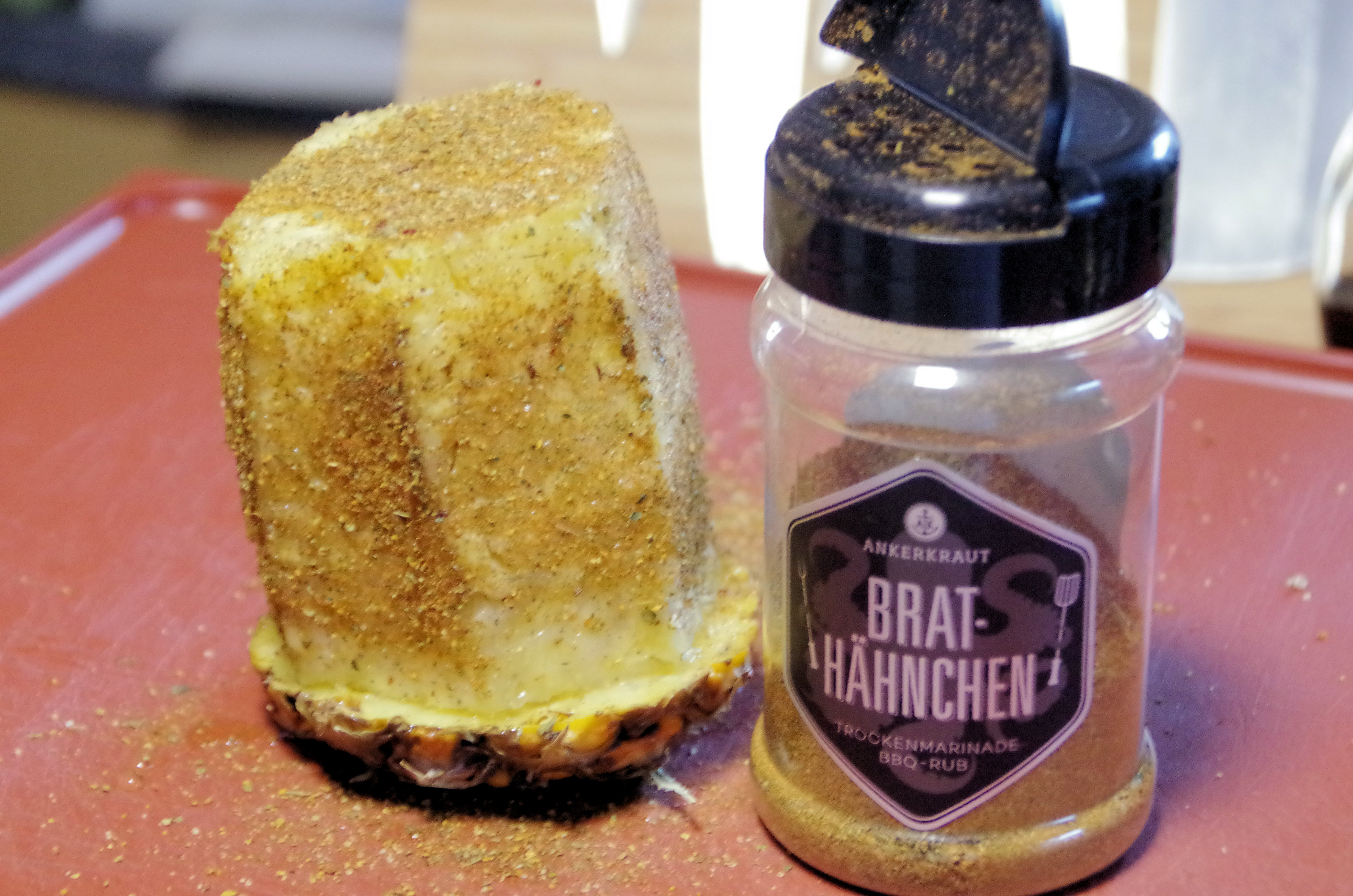 Zuerst sollte aus der Ananas ein Sitz für das Hähnchen geschnitzt werden. Dieser wird mit dem Brathähnchengewürz eingepudert. Das Ananas Butt Chicken soll ja auch von innen gewürzt werden. Sollte am Schwanzansatz den Hähnchens noch etwas Fett baumeln kann dieses abgeschnitten und oben auf die Ananas gelegt werden.