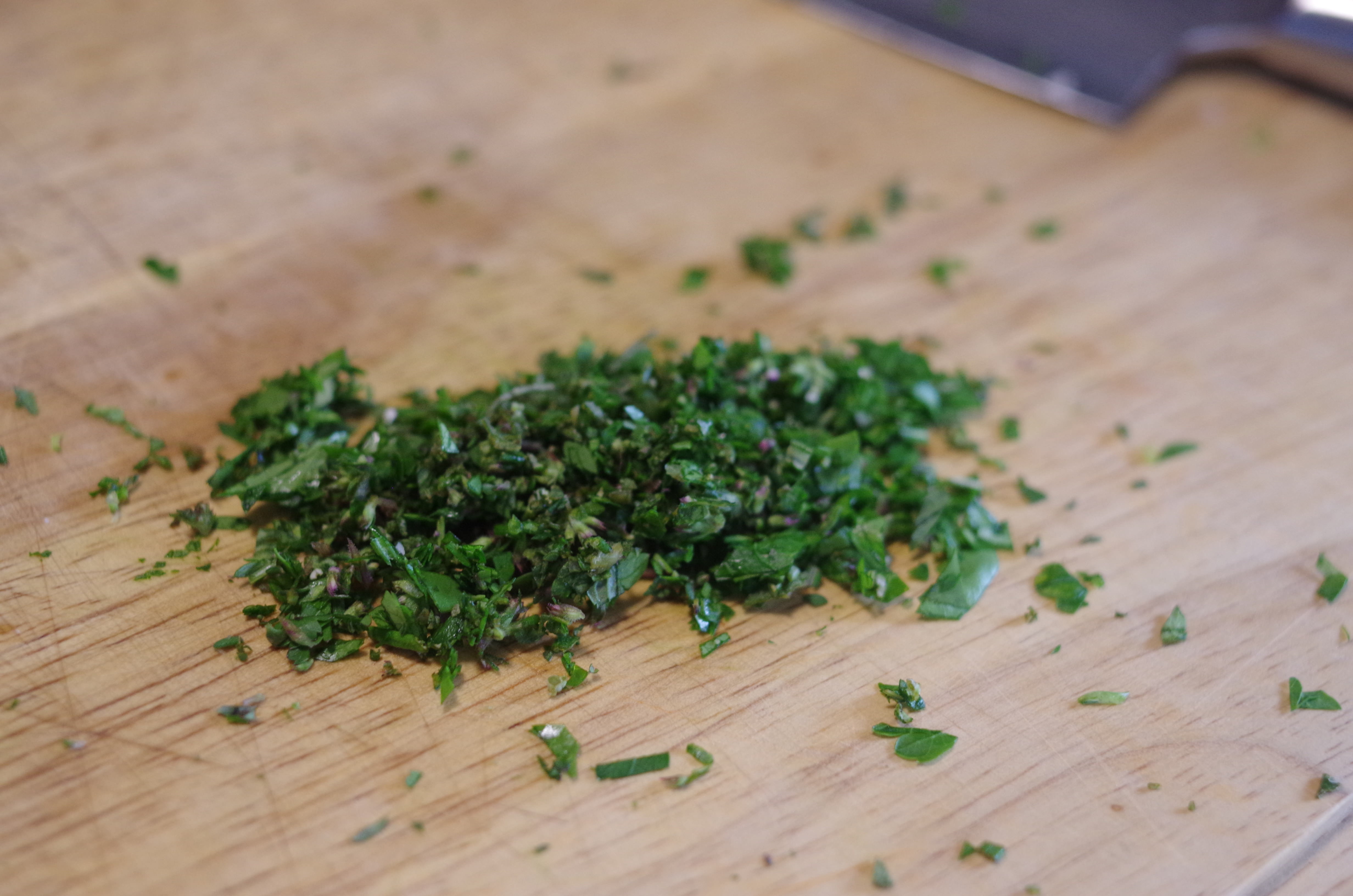 - eine Hand voll frische Kräuter (Rosmarin,Thymian, Rucola, Petersilie, Salbei)