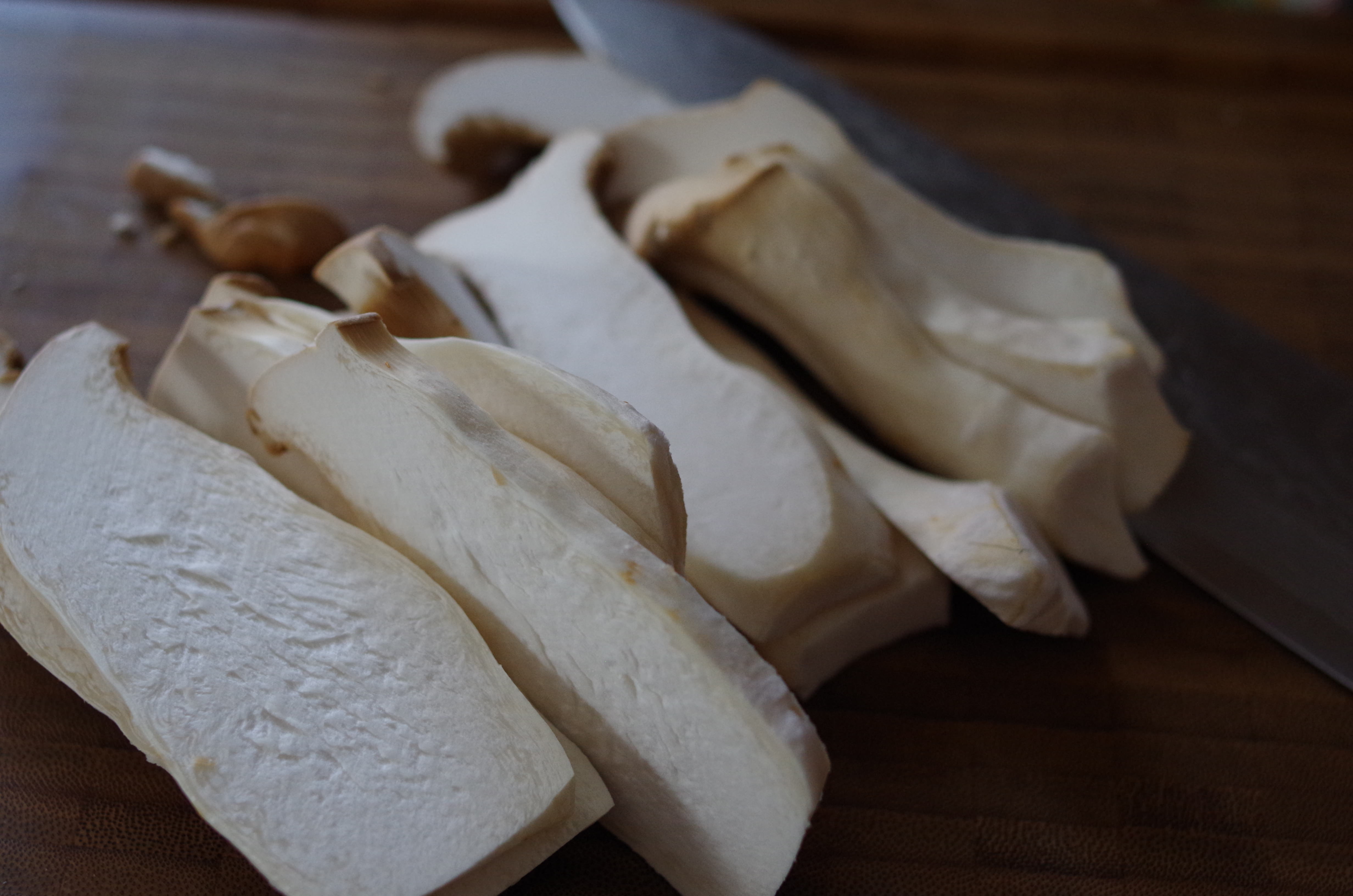 Zuerst die Kräuterseitlinge in Scheiben schneiden.