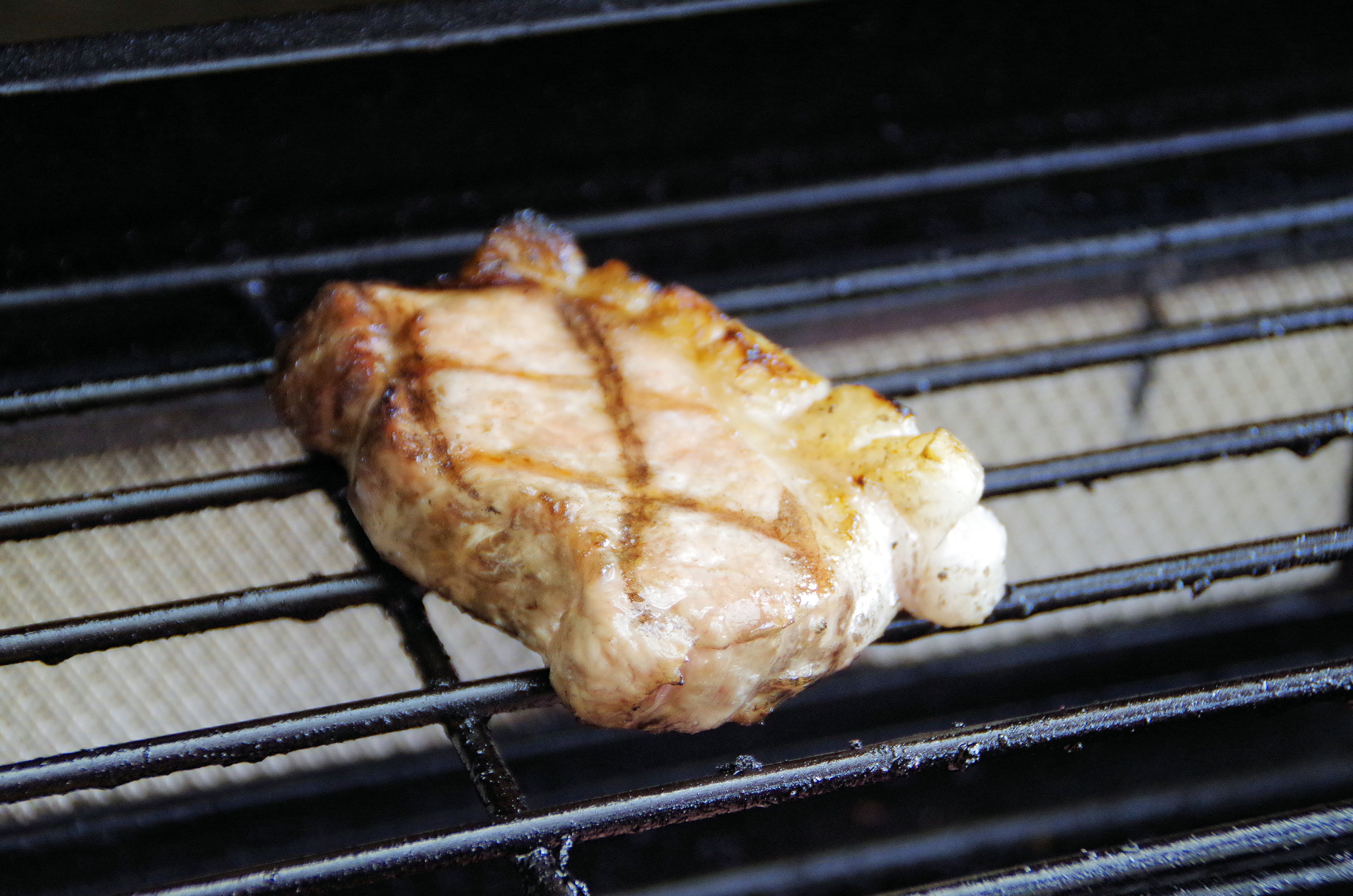 , durch den Fettrand kann es hier schnell zum Brand führen. Also schnell wieder runter und bei 120 Grad im Grill auf 61 Grad Kerntemperatur ziehen.
