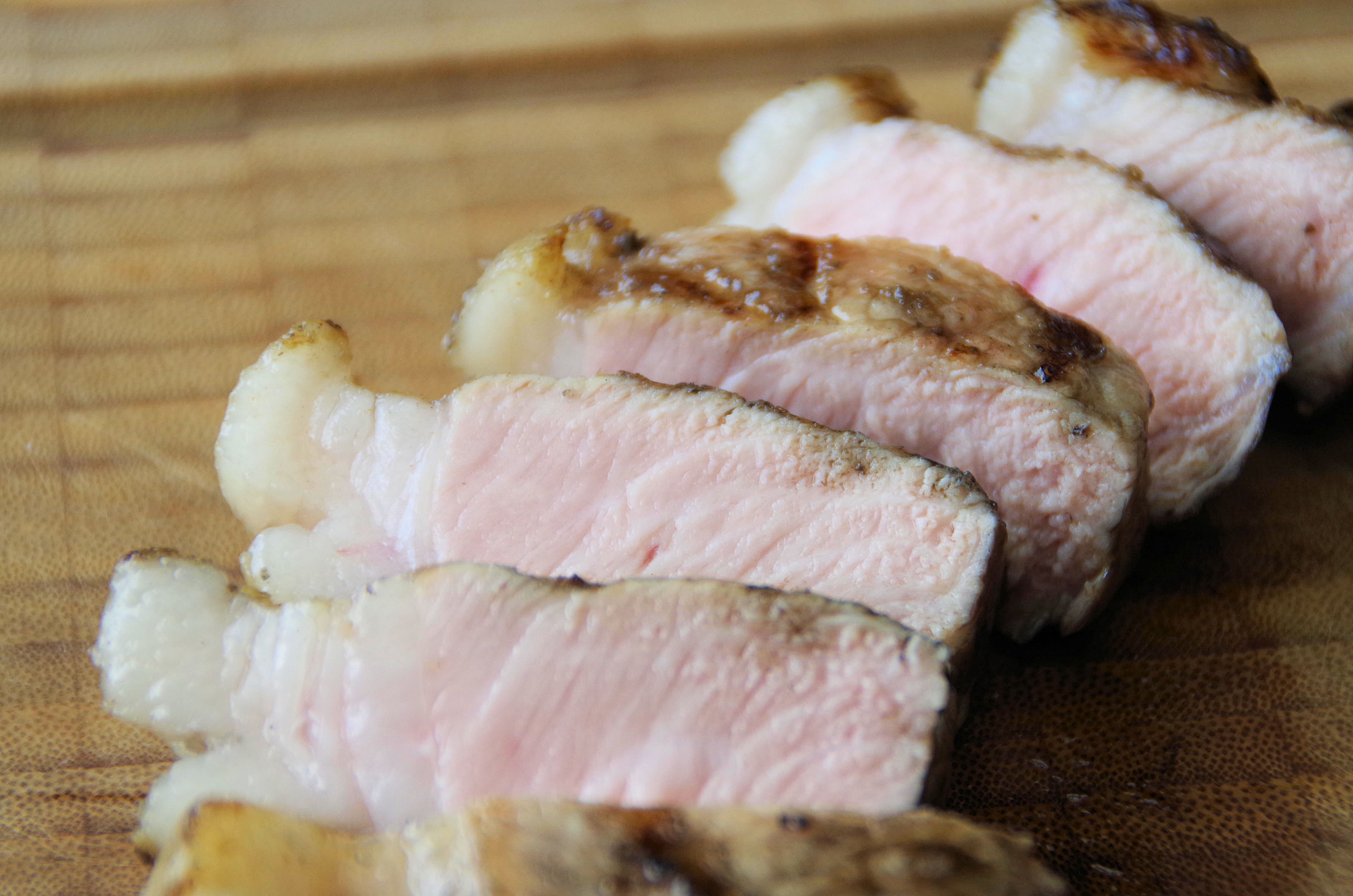 Wenn die 61 Grad erreicht sind kommt das Stück auf ein Brett und darf dort ca 2 Minuten entspannen. Dann mal anschneiden. Die Farbe und die Textur sind wirklich schön beim Schneiden.