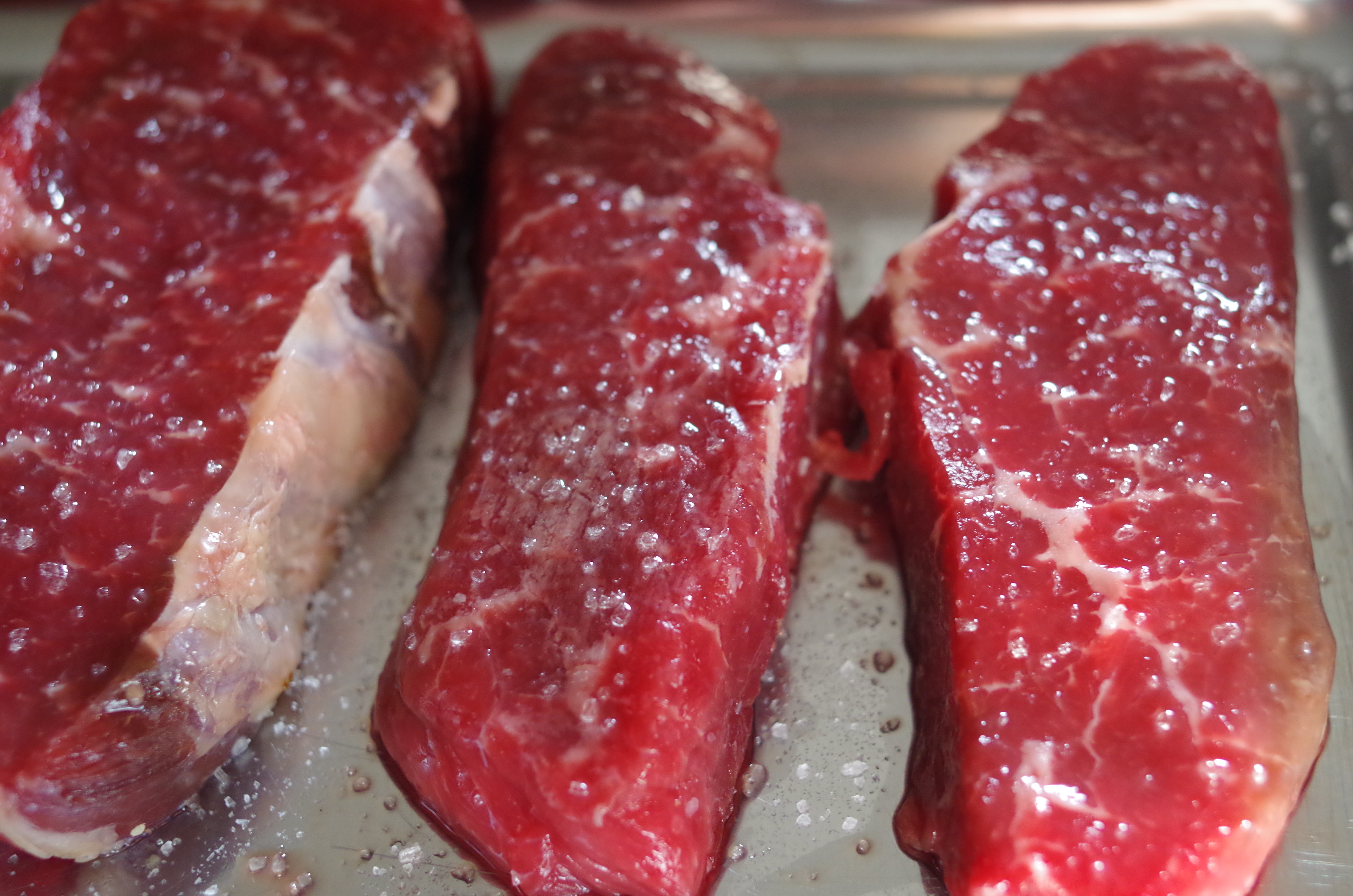 Zur Vorbereitung aufs Grillen salze ich die Steaks mit Meersalz und lasse sie ca 20 Minuten Zimmertemperatur annehmen.